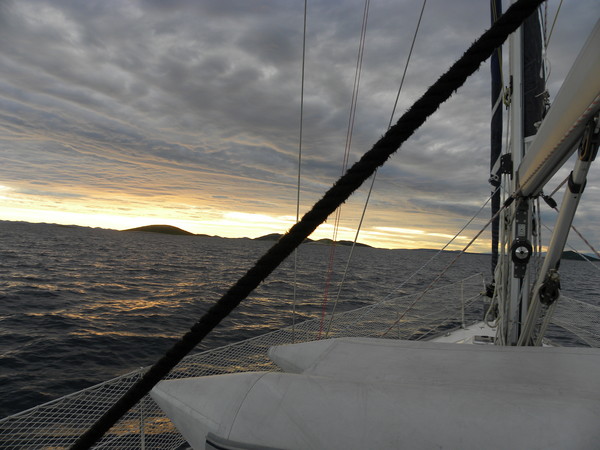 Auslaufen von Veruda (Pula) am Sonntag früh, mit der Absicht, gleich einen Nachtschlag zu fahren. Am Südzipfel von Mali Losinj ankern und übernachten in der Balvanida Bucht, da das Wetter nicht optimal, und die See ziemlich rauh ist.